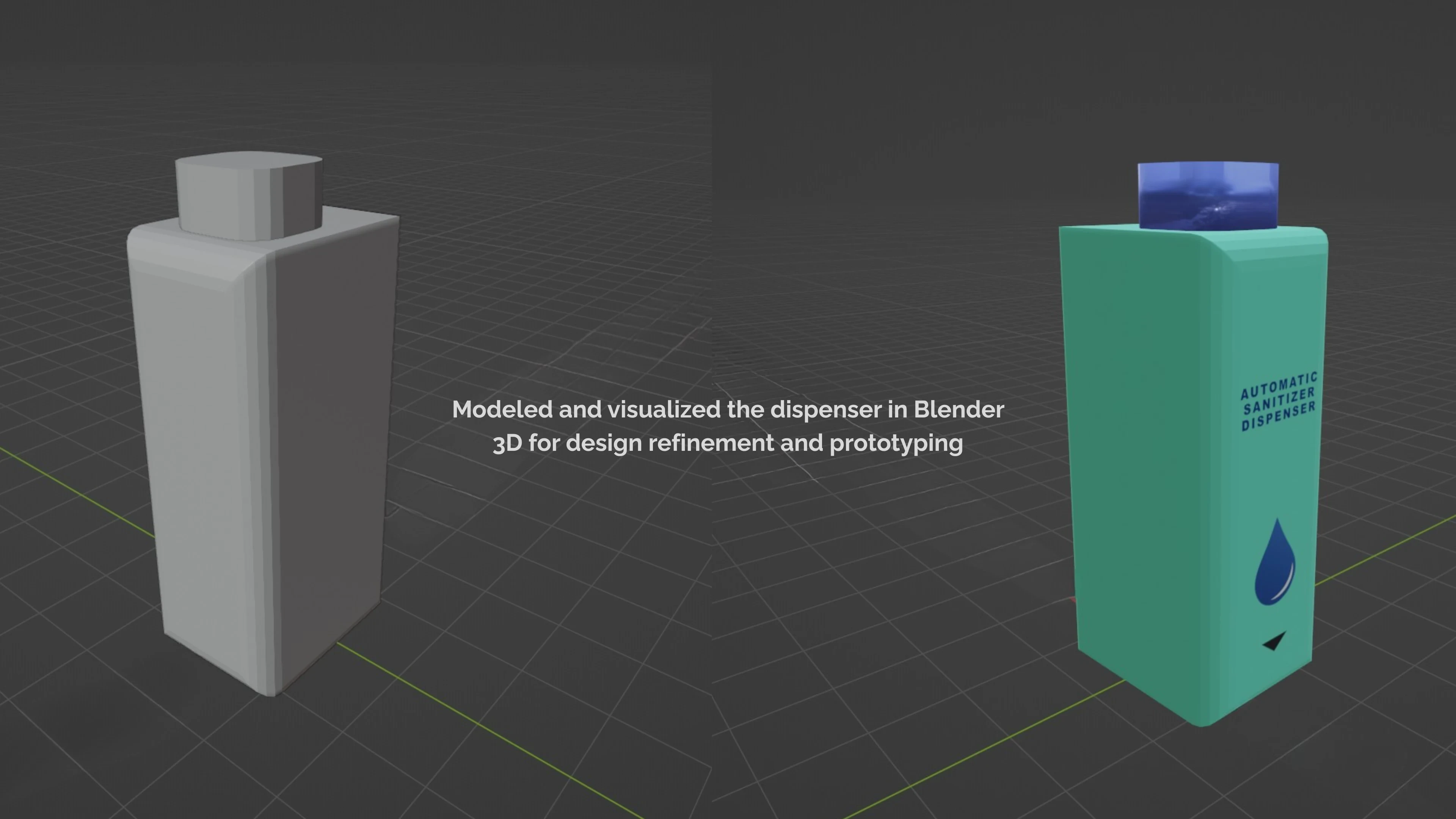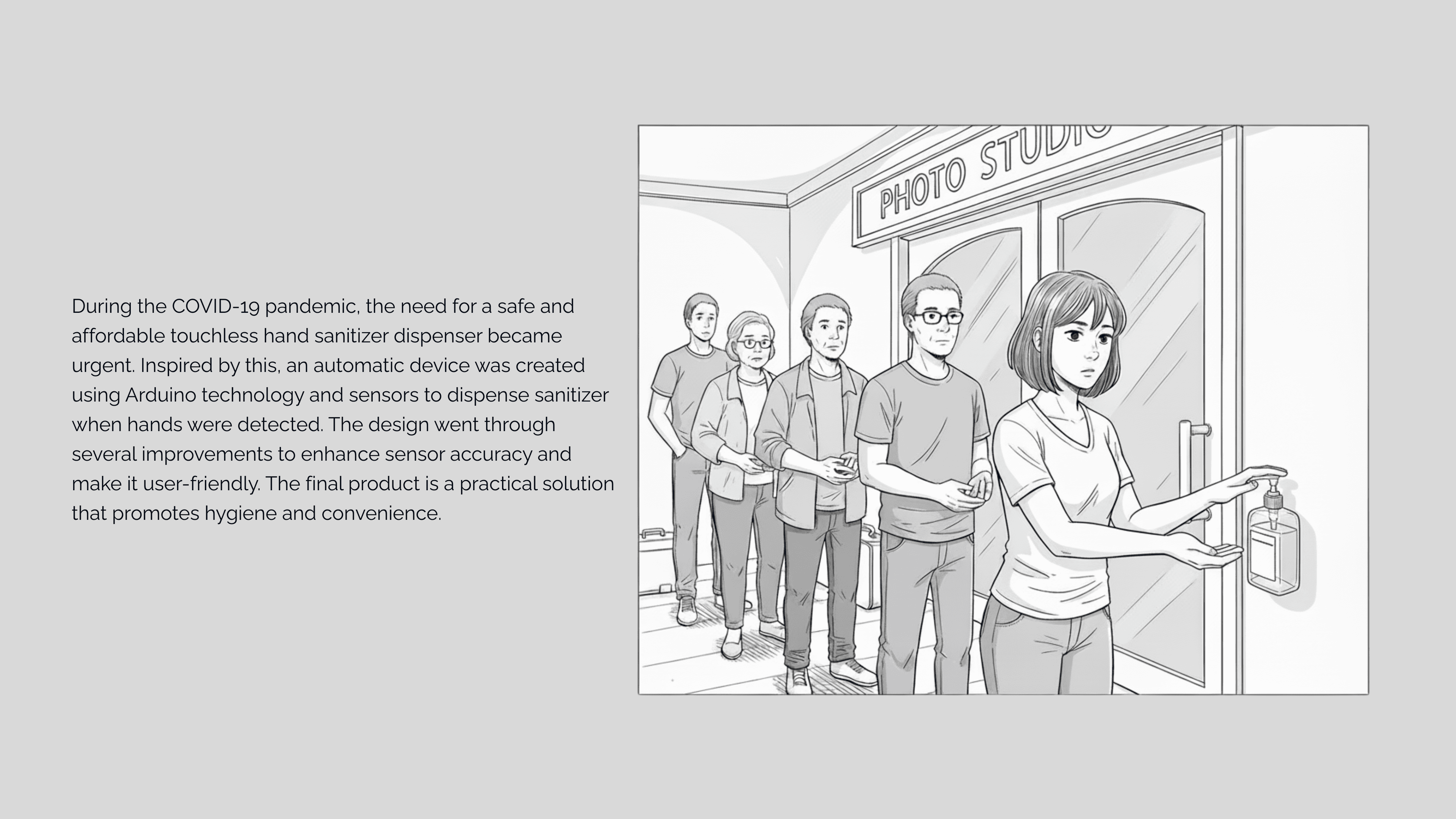An affordable, touchless hand sanitizer dispenser developed to reduce physical contact and promote hygiene during the COVID-19 pandemic. Version 1 used an Arduino microcontroller, IR sensor, and servo motor to detect hands and dispense sanitizer automatically. Following issues with false triggers and bulky design, Version 2 employed an ultrasonic sensor and solenoid valve for accurate, faster dispensing in a lightweight and ergonomic form. The design includes refill level indicators and was batch-produced for real-world use, demonstrating iterative problem solving and practical embedded system implementation.